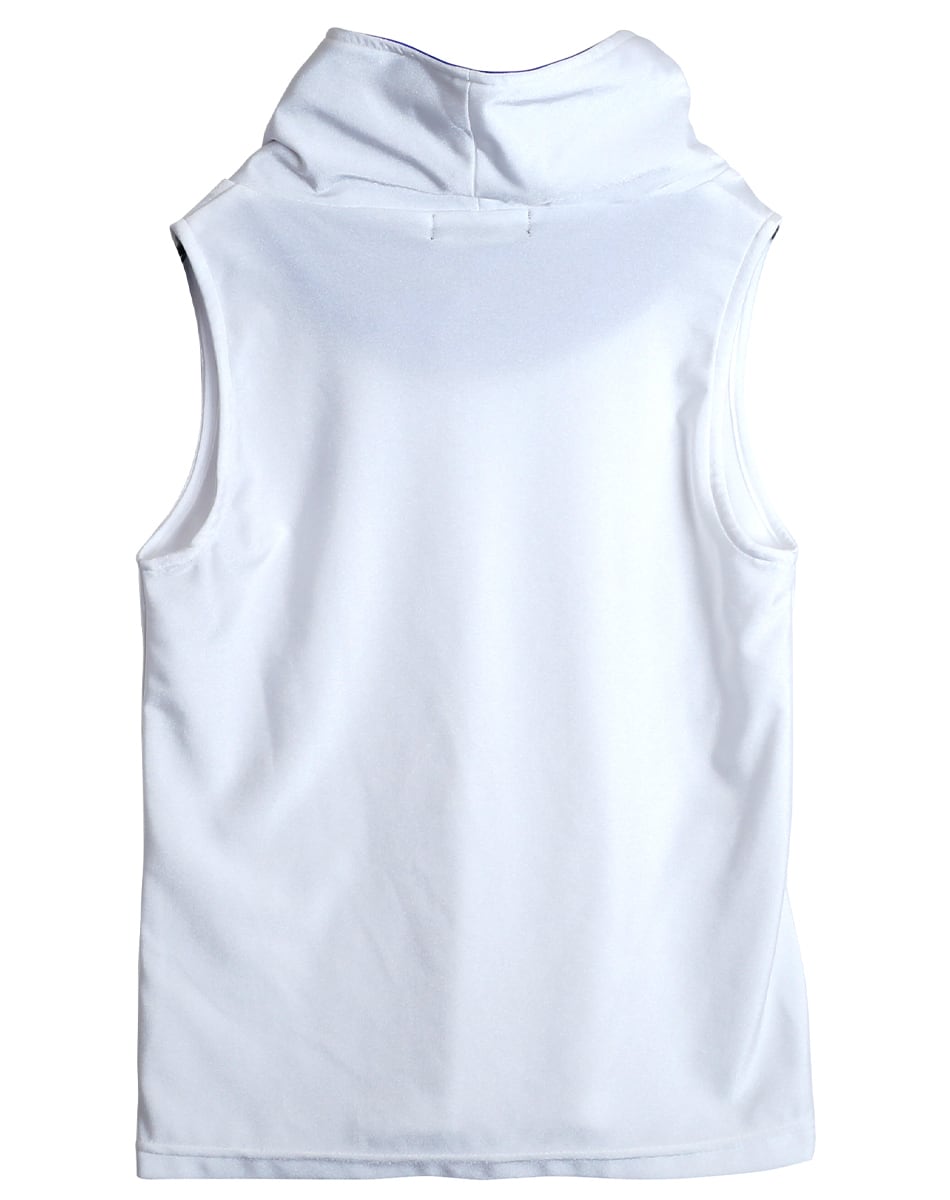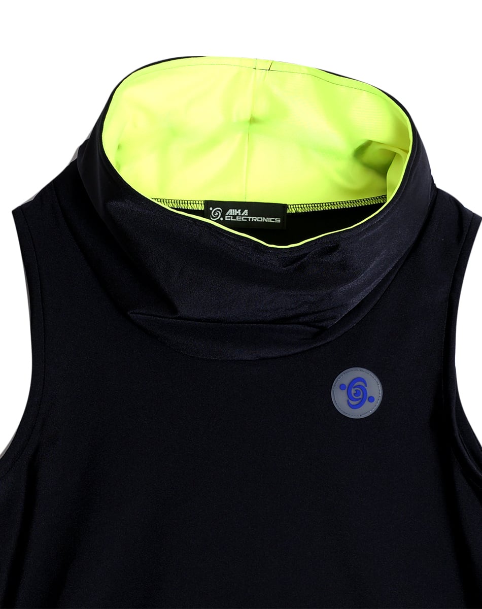 シンプルなノースリーブシルエットに立体フードを掛け合わせ、ストリートとサイバーを融合させた近未来的なトップスです。