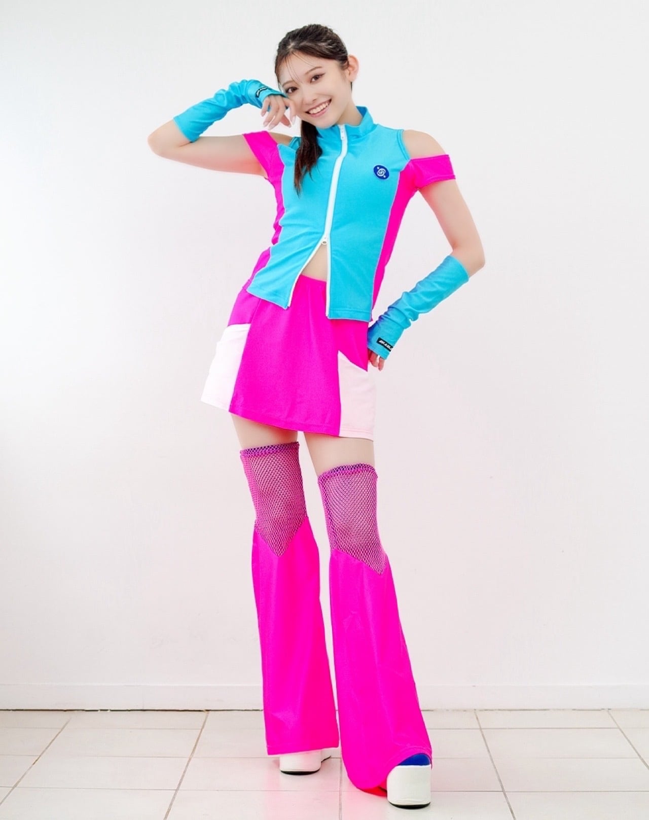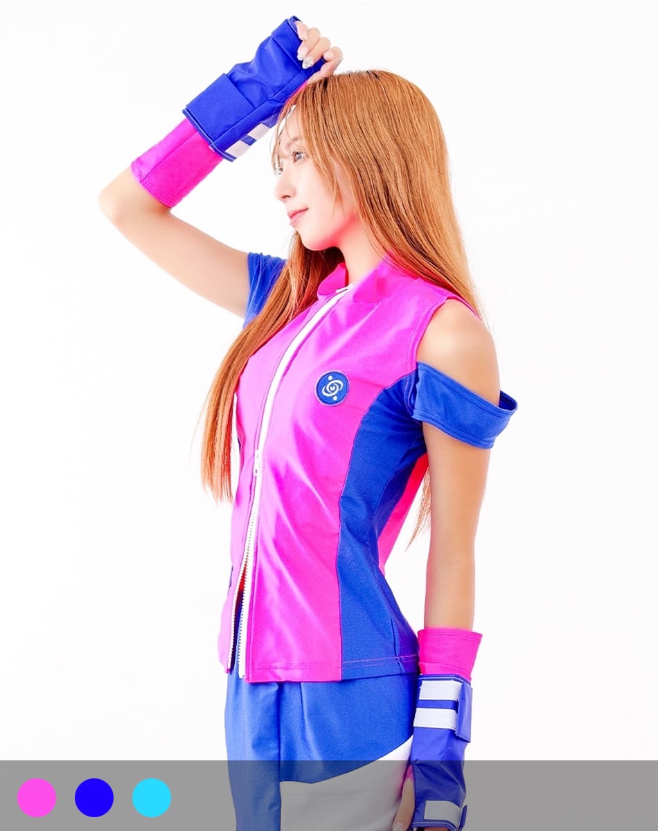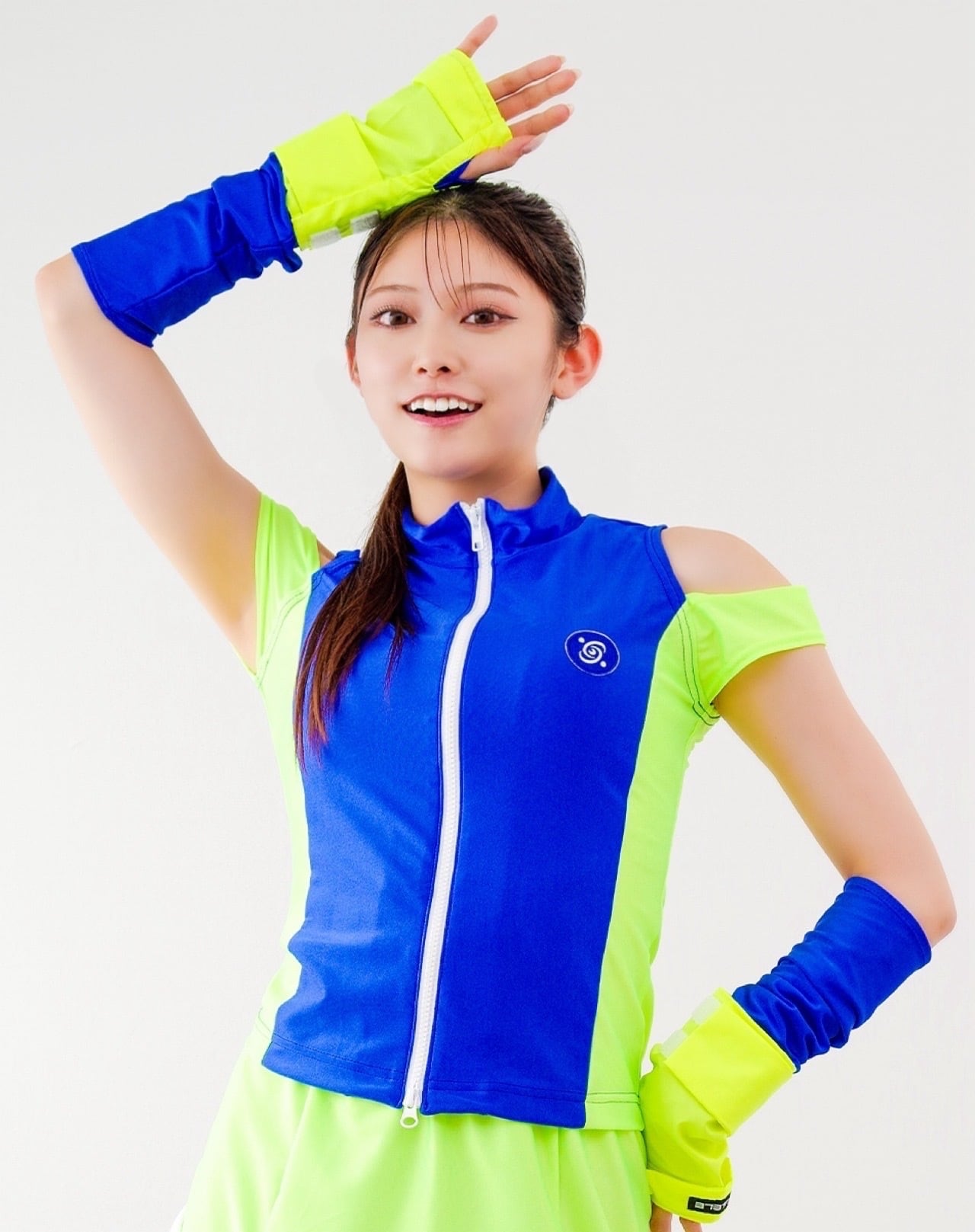 キュートとクールを混ぜ合わせた近未来系のサイバーギア、腕のワンポイントがクールなノースリーブZIPトップです。