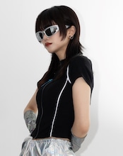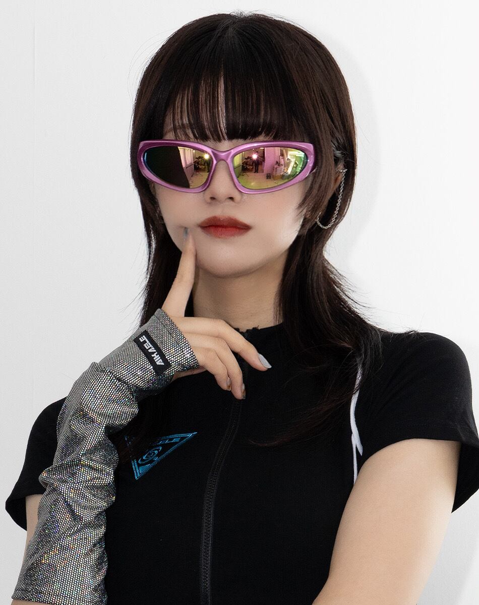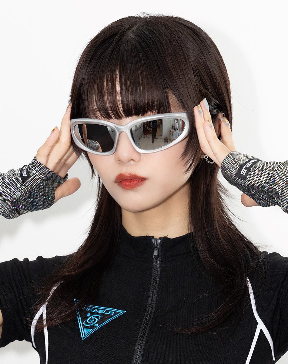 シャープな横長フォルムと、発色の強いカラーレンズが生み出す近未来シルエット。